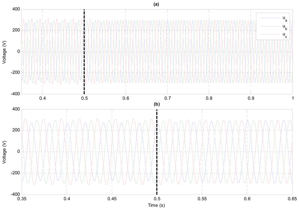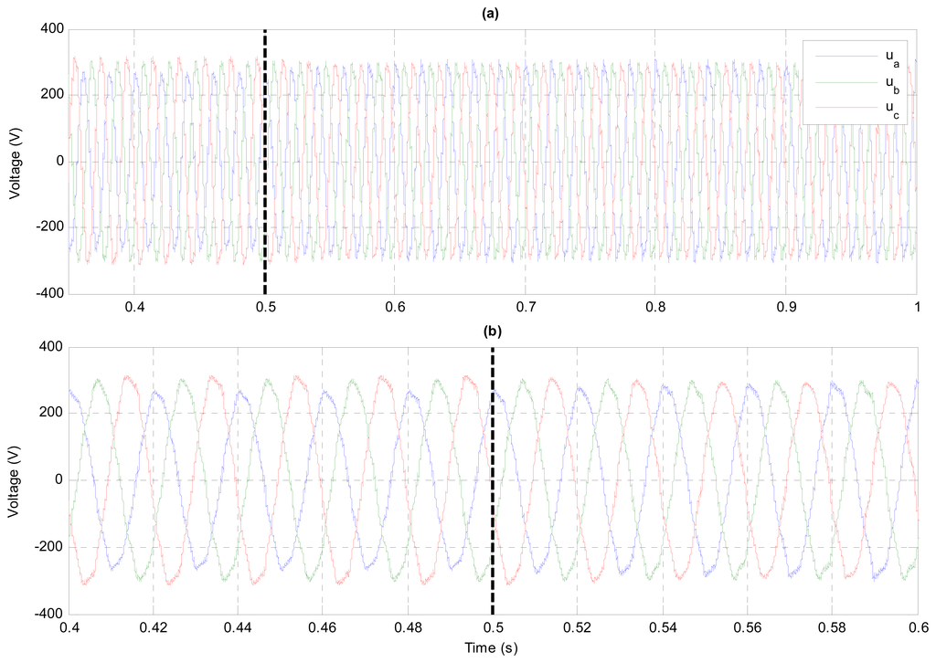The methods studied here for sampling the PCC voltage are similar to those shown in []. With the system configuration defined in Table 1, several methods for performing the PCC voltage sampling are shown in Figure 11 []: