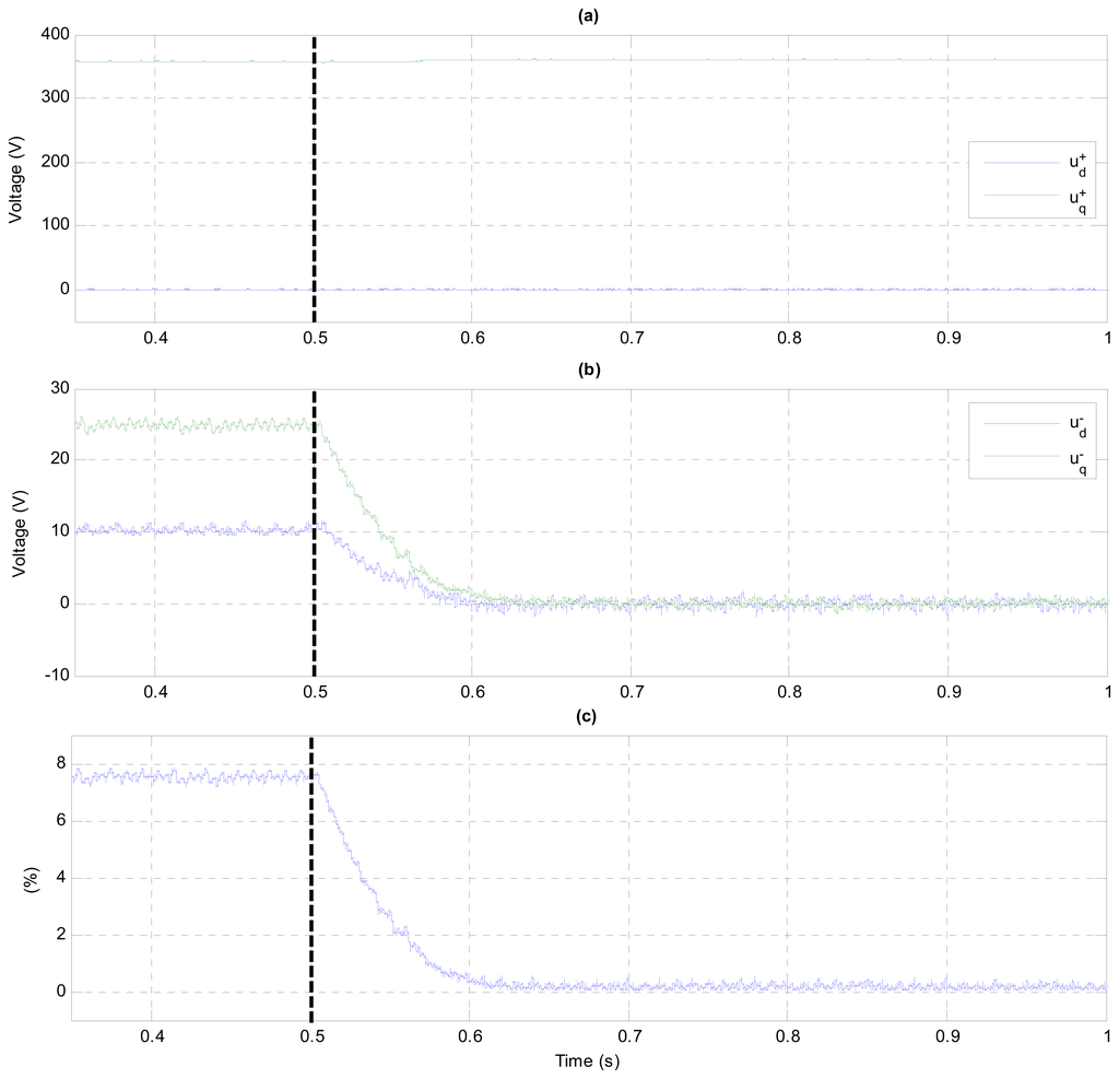 Figure 14 shows the temporary evolution of the filtered PCC voltage in abc-axes. Its non-filtered waveform presents a high ripple due to the high grid impedance and, in order to appreciate the effect of the PCC voltage controller, its filtered waveform is the one represented. In the following figures, the corresponding control activation time is marked with a dashed black line. It is clear that, when the voltage control is enabled, the PCC voltage is balanced. This is corroborated by decomposing this voltage in their positive and negative sequences as shown in Figure 15. The positive sequence remains equal because its reference voltage corresponds to the value it had before enabling the PCC voltage control. The negative sequence becomes almost zero since its reference voltage is set to zero for both d and q components, as well as the VUF.