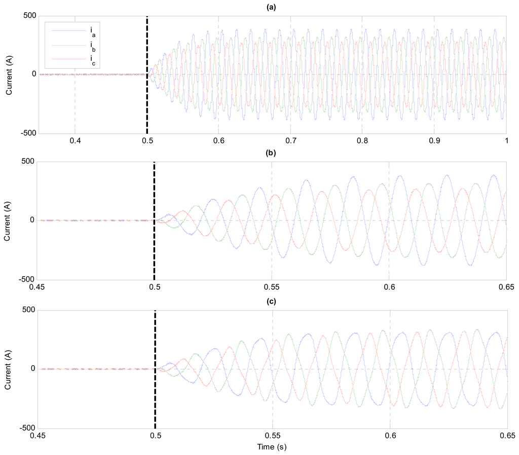 The current flowing from the VSC to the grid is represented in Figure 16a in abc-axes. Since no load is connected to the PCC, the current before enabling the voltage control is zero. Afterwards, the VSC provides an unbalanced current in order to compensate the negative sequence component. This is better observed in Figure 16b, which is a representation of Figure 16a between t = [0.45 0.65] s. Figure 16c is the equivalent of Figure 16b if the resonant controller 2ω is not included in the DC-link voltage controller, showing a PCC current with a 3rd order harmonic.
