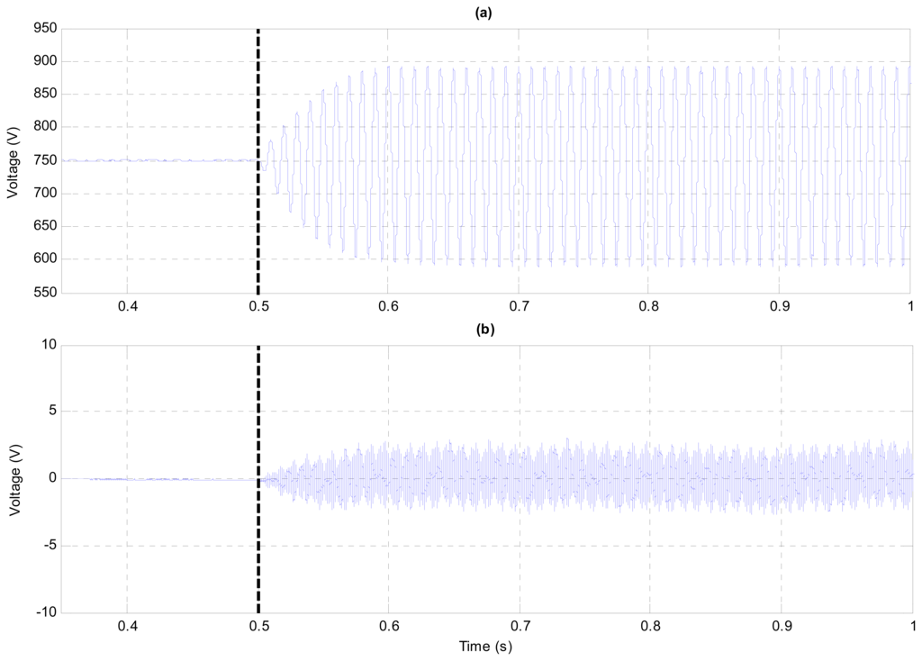 A simulation has been carried out with MATLAB/Simulink® in order to test the performance of the proposed voltage controller. The ideal grid voltage of Figure 2 has been considered, along with the system parameters of Table 1. The NPC rated power is 100 kVA and the DC-link capacitors have a value of CDC1 = CDC2 = 4.5 mF. No load is connected to the PCC. The proposed voltage controller is enabled at t = 0.5 s.
