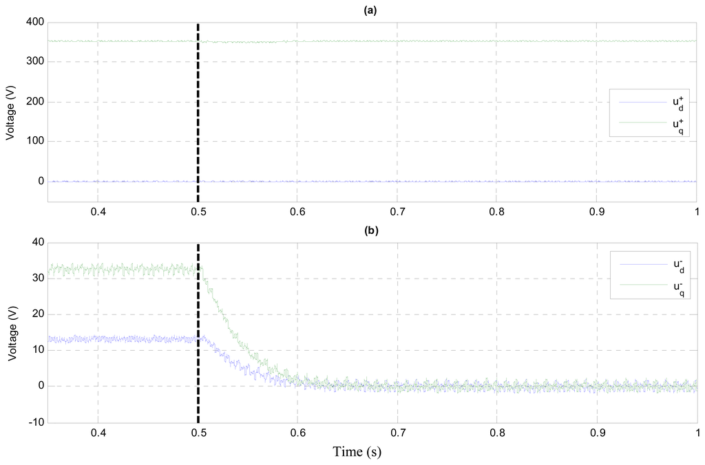 An unbalanced voltage has several negative effects. For instance, it reduces efficiency and can cause failure in induction machines []. It also produces negative effects on power electronic converters. The voltage unbalance can impair a Pulse-Width Modulation (PWM) converter system because the input active and reactive power ripples are generated by the cross products of line currents and unbalanced voltages []. The grid synchronization algorithm has to be sufficiently fast and accurate to extract the positive and negative voltage sequences precisely, in order to generate the output current references. A PCC voltage controller is needed to cancel these harmful effects while allowing an independent control of positive and negative sequence components.