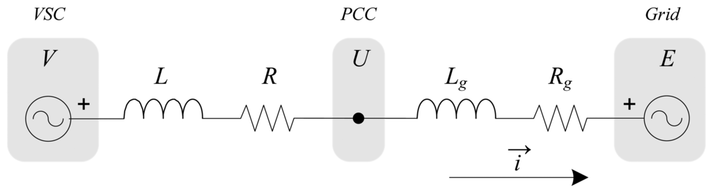 A VSC can be represented as an ideal AC voltage source (per phase). Therefore, its connection to the grid can be depicted according to the scheme of Figure 3, where L and R are the grid filter parameters, Lg and Rg are the grid impedance parameters, V is the VSC output voltage, U is the PCC voltage, E is the ideal grid voltage and ι⃗ is the current flowing from the VSC to the grid.