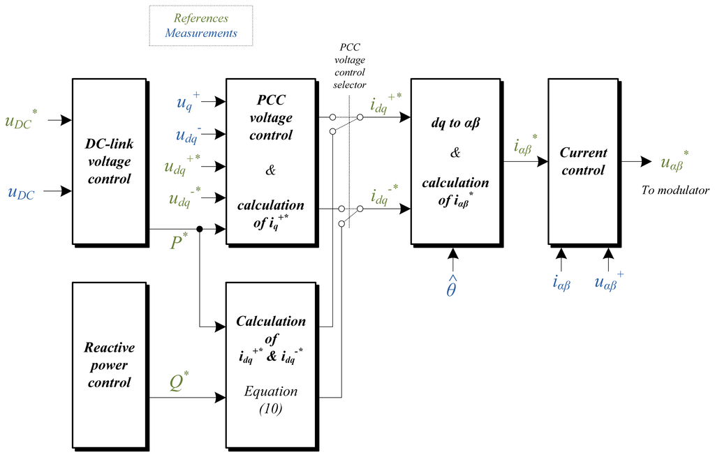 In first place, the active power reference P* is set by the “DC-link voltage control” block. Its output constitutes an input for two possible blocks, namely, “Calculation of and ” block or “PCC voltage control & calculation of ” block. Depending on the application, one block or another will be chosen. The output of both blocks is the dq-axes reference current (positive and negative sequence, and ). The following stage is the dq to αβ transformation plus the calculation of . Finally, the low level control is performed by the “Current control” block and the modulation strategy.