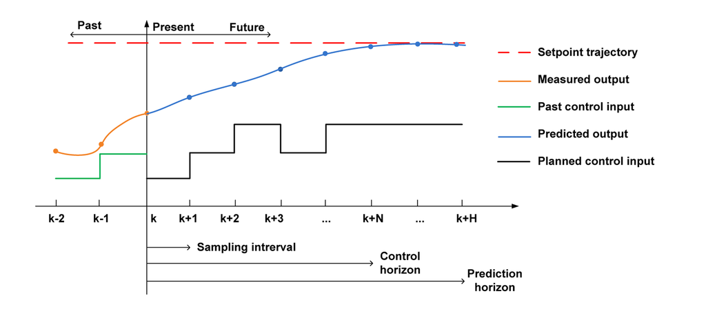 One of the most successful classes of closed-loop model-based anticipating schemes is the model predictive control (MPC) paradigm, also called receding/moving horizon control. MPC relies on an estimate of the current system states at discrete time instant tk = k × Tc and an explicit model of the system in order to predict the future output behavior via simulation over a finite window [tk,…, tk+H], for a set,
