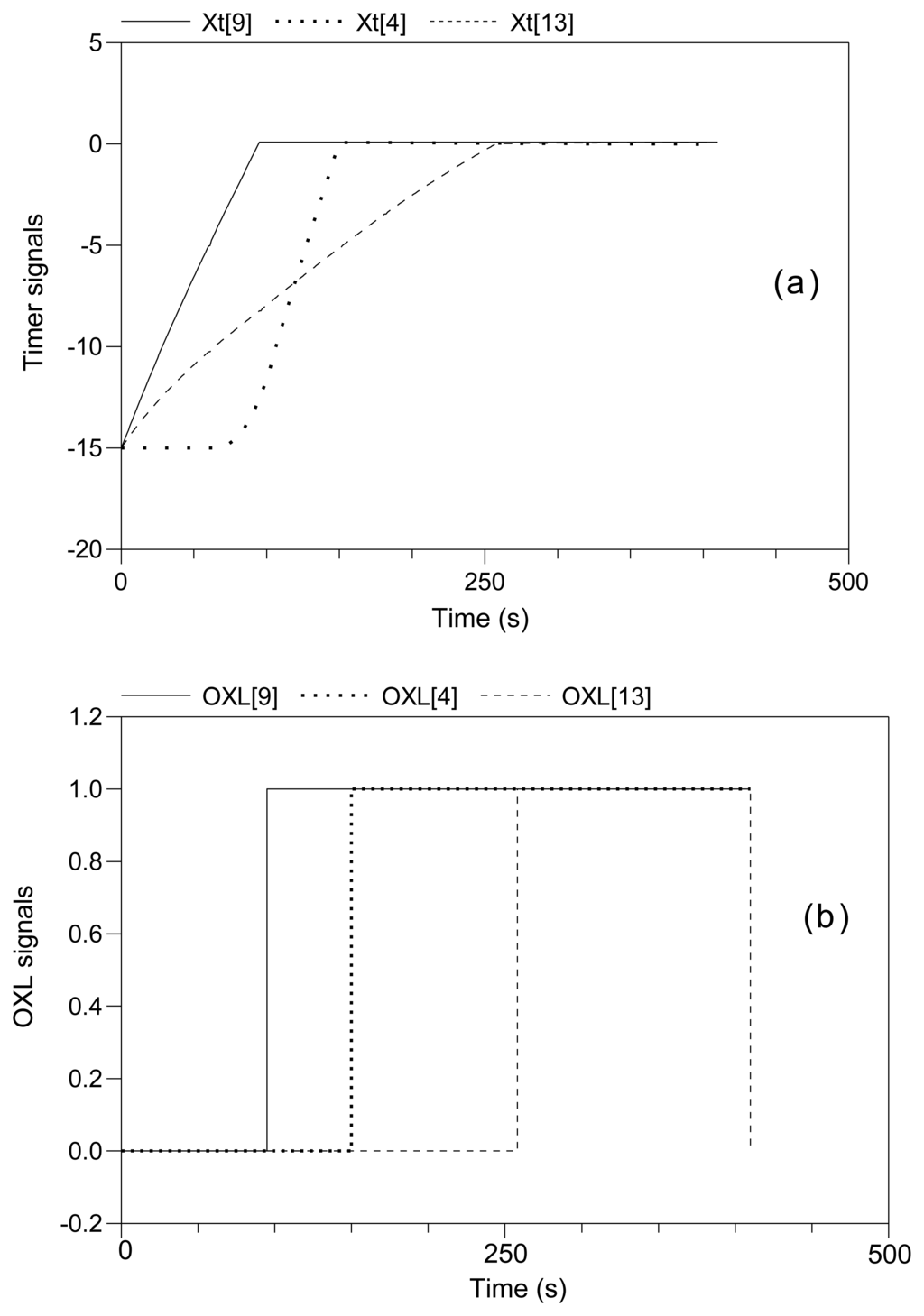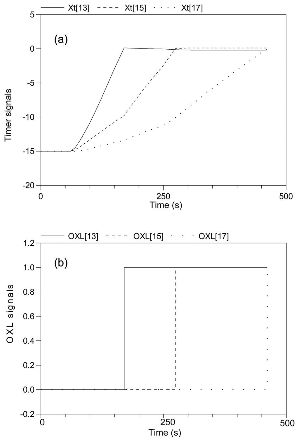 Figure 8 shows the voltage evolution at Buses 4046, 4047 and 4043, which, controlled according to decentralized MPC, experience the largest drop, when the local MPCs receive no information from their neighbors, and assume that the neighbors will take no control action. The overall system survives until t = 461 s, when simulations stop, lasting some 235 s longer than that with decentralized deadband control. This uncoordinated decentralized MPC approach, as shown in Figure 9, leads to the activation of OXLs over three machines, g13, g15 and g17, at t = 170, 274 and 459.8 s, respectively.