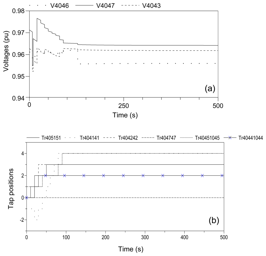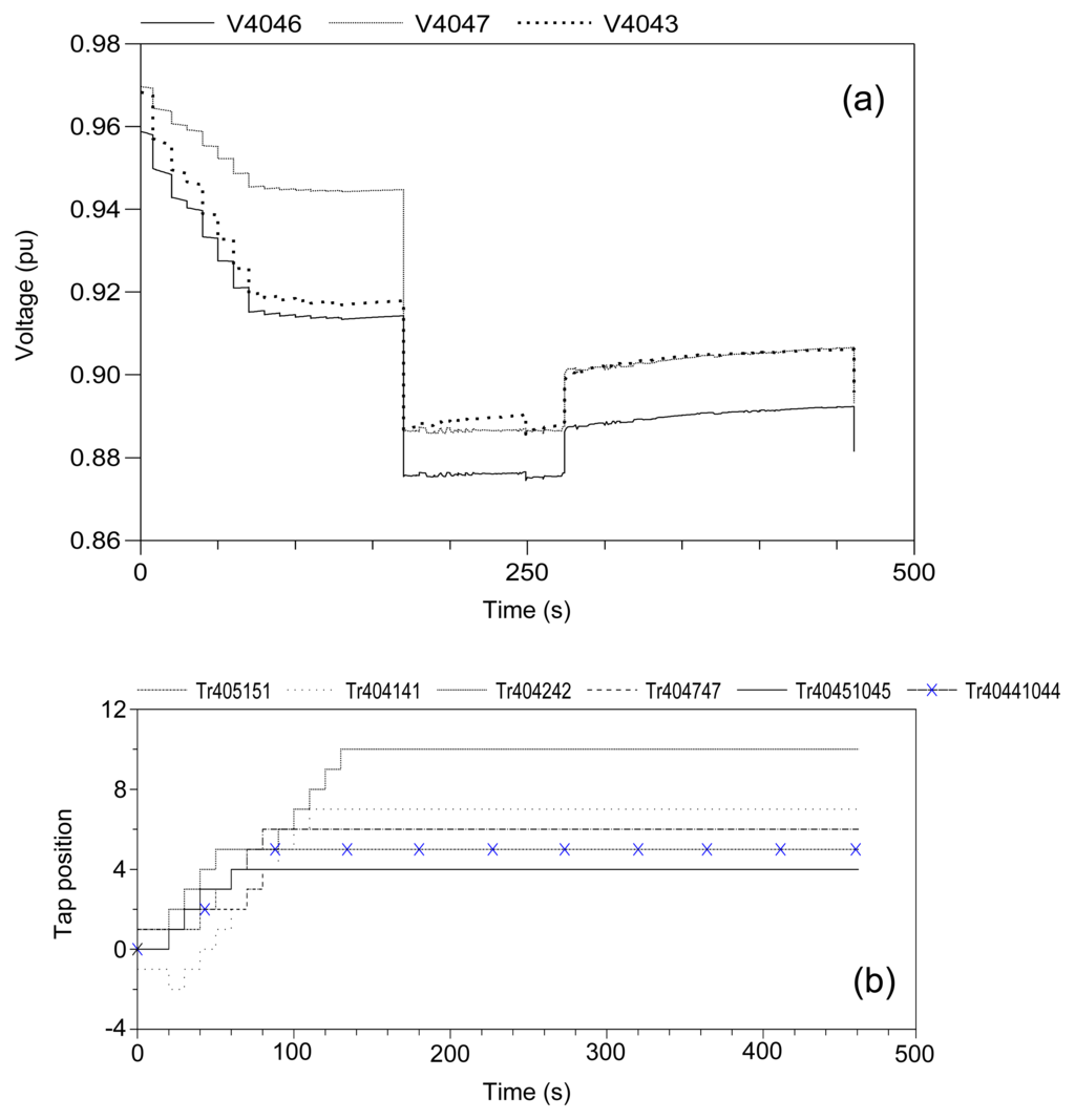 The bus voltages are quite similar to (but lower than) those of the base disturbance in Case 1, all stabilized within the limits in the long term. However, in response to initiating (at t = 0 s) a “disturbance-like” load change in Central6, the local LTC, Tr40441044, advances its upward tap move (from t = 20 s in the base disturbance) to t = 10 s, continued by another upward tap move at t = 20 s in response to the line outage at t = 10 s. Furthermore, the neighboring LTC, Tr4047, in Central4 reacts to the nearby load change by taking a downward tap move at t = 20 s, and LTC Tr4042 in Central2 changes its (original base disturbance) LTC moves by freezing its upward moves at t = 30 s (instead of t = 40 s). The other neighbors do not change their LTC moves at all by properly coordinating them with this new set of control actions taken by the CAs in Central6, Central4 and Central2.