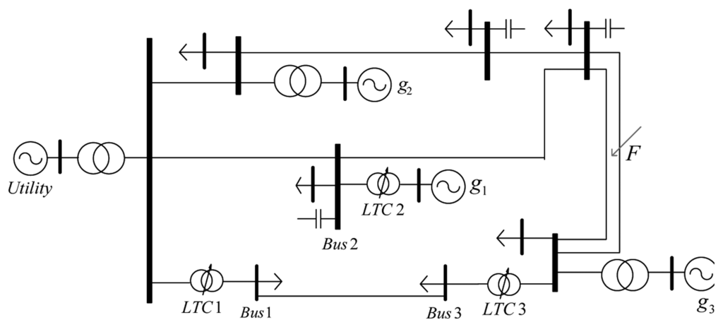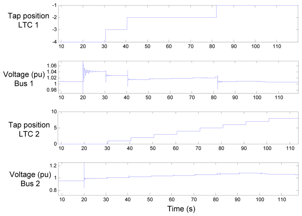 The following example of the 12-bus meshed test system, shown in Figure 3, is adopted from [9] to illustrate why coordination is necessary for voltage control in power systems and how different local control actions can trigger each other. The three identified local control agents CAi, i = 1, 2, 3 try to use LTCs 1, 2 and 3 to locally maintain the voltage of Buses 1, 2 and 3 within an upper and a lower bound [0.98, 1.02] p.u. by using a standard deadband strategy. Two pairs of “LTC moves-bus voltage”, namely (LTC 1, Bus 1) and (LTC 2, Bus 2), are shown in Figure 4, following the outage of one of the parallel lines in the location, F, at t = 20 s. Following the fault, both LTCs, after a delay of 10 s, try to restore the corresponding local voltages. As one can see, the voltage of Bus 1 is already within its safety limit around t = 40 s, but still, one extra move around t = 82 s is observed. The reason is that LTC 2 causes the voltage at Bus 1 to drop below its threshold, again causing LTC 1 to activate its local deadband strategy. Thus, this extra move is indeed attributed to the interaction between LTC 2 and Bus 1 (via LTC 3 and Bus 3). A possible coordination scheme should aim, at least, at avoiding these kinds of interactions among local controllers (if more is not necessary).