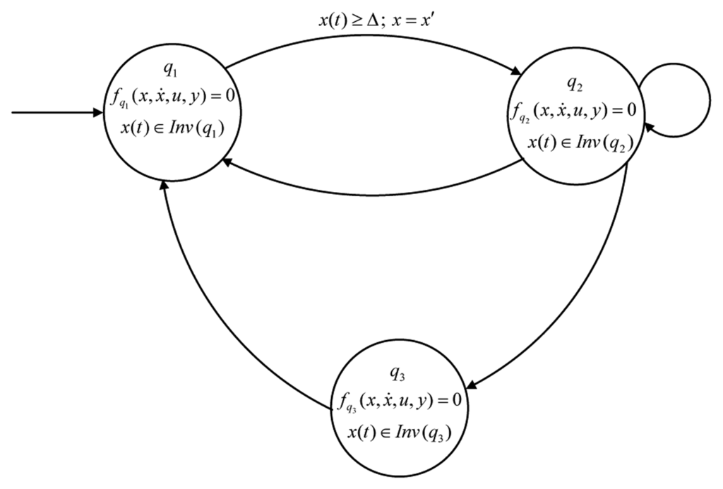 An HA is a dynamical system describing the time evolution of a system involving the interaction of both continuous and discrete state variables. For example, the HA of Figure 5 operates as follows, defining the possible evolutions for its hybrid states, (q, x) ∈ (Q, X). It starts in the initial state, (q1, x0) ∈ Init, where the corresponding dynamics represented by the DAE fq1 (x, ẋ, u, y; x(0) = x0) = 0 is followed, as long as x ∈ Inv(q1). As soon as the guard condition, Δ ∈ G(q1, q2), is fulfilled, the event e = (q1, q2) ∈ E occurs. This resets x to x′ ∈ R(e, x, ẋ, u, y), making a transition to state (q2, x) where the corresponding dynamics fq2 (x, ẋ, u, y) = 0 is followed, as long as x ∈ Inv(q2), and so on. Note that Inv(q) denotes the invariant set in mode, q ∈ Q, Init the set of initial hybrid states, E the set of events, e, G the set of guard conditions and R the reset map [14].