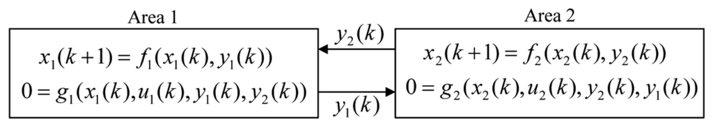 Figure 6 shows a simple, but prototypical, multi-area power network composed of only two interacting areas. The behavior of each area is effectively represented by the difference-algebraic equations, ignoring the discrete-event state variables, for simplicity. The areas physically interact via infinitely fast-changing algebraic state variables, i.e., y1 and y2 (voltage/current or active/reactive powers over the tie-lines).