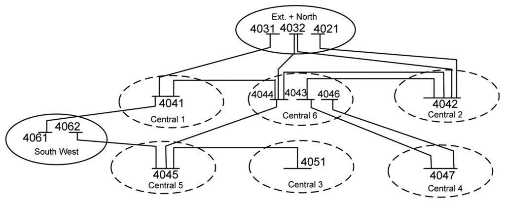 It is of interest in this article to find out what is the contribution of combining anticipation and coordination to improved performance of the DCMPC. The authors of [5] compare the good performance of the DCMPC approach with the uncoordinated decentralized deadband control of LTCs, illustrating the joint contribution of the anticipation and coordination feature of the DCMPC. This article, in order to find out the sole contribution of coordination, compares the results presented in [5] with the uncoordinated decentralized MPC approach, under identical disturbances. We consider two disturbances, on a slightly modified version of the CIGRENordic32 test system [17]. A one-line diagram of the decomposed Nordic32 is shown in Figure 7.