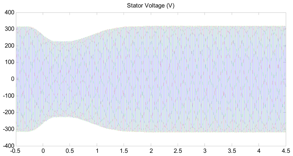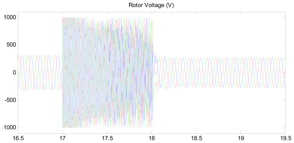 In Figure 10 the rotor voltage is represented. This voltage is limited to the real installation rated level but, as stated before, it could be increased in case an improvement in rotor current control might be needed. The rapid increase of the rotor voltage is a direct consequence of the imposed sudden variation of the rotor currents to which inductive circuits always tend to oppose.