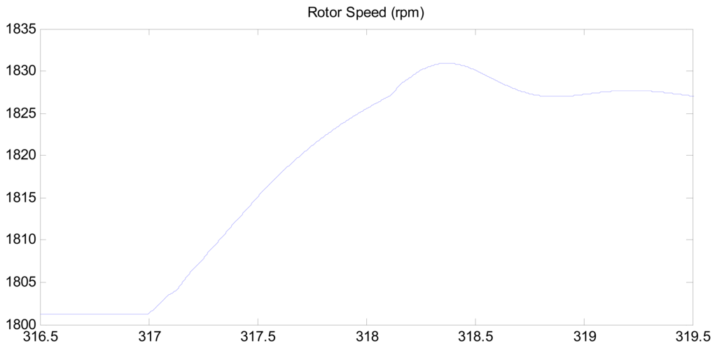 It should be noted that during the voltage sag, active power delivered to the grid (zero) is not balanced with the mechanical power obtained from the wind turbine. This causes an acceleration of the wind turbine that in any case will be dangerous due to the exceptional moment of inertia of the turbine itself. In Figure 11 it can be seen that the expected acceleration is only 40 rpm which is less than a 2% increase.