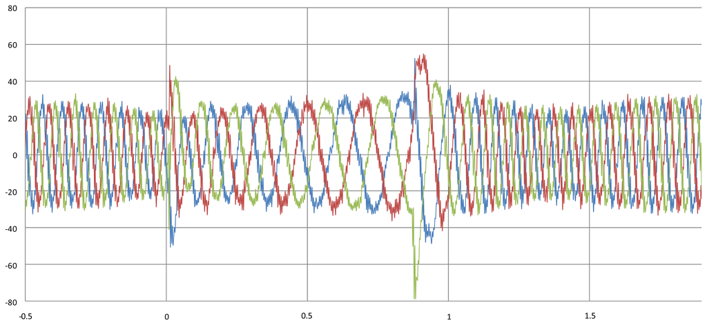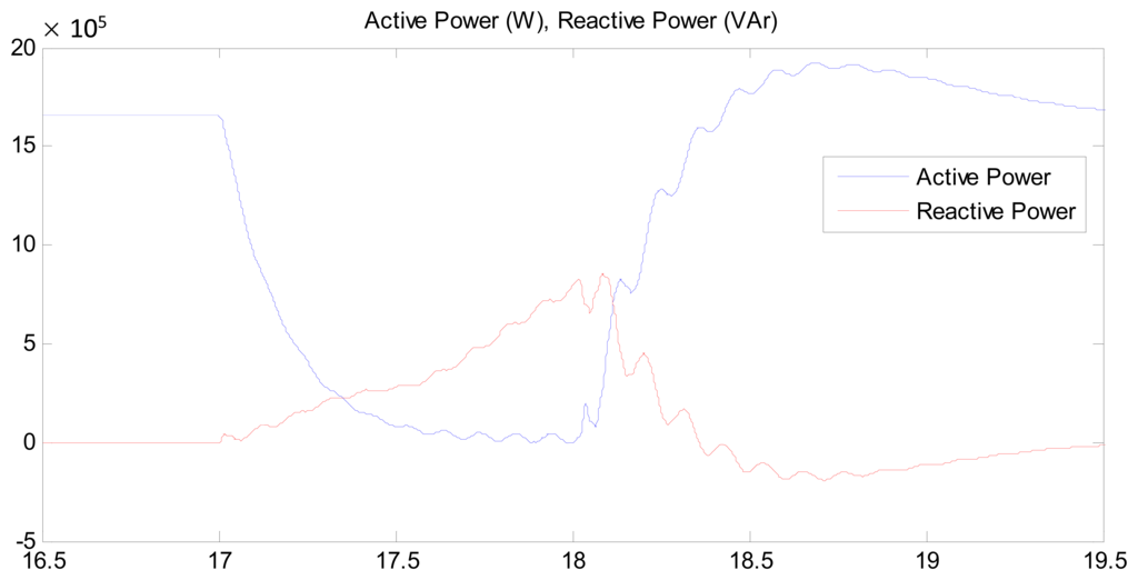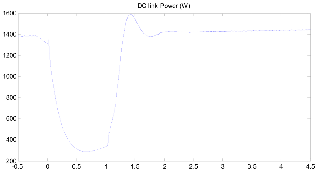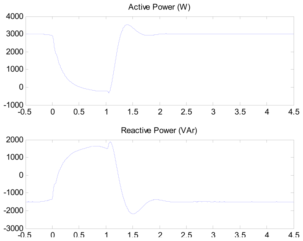 Figure 12 shows the disturbance imposed on the test-bench. Figure 13 shows the active and reactive power exchanged with the grid, illustrating how the control strategy reduces the active power to zero, while increasing the reactive power delivered to a point where the rotor currents achieve their permitted maximum.