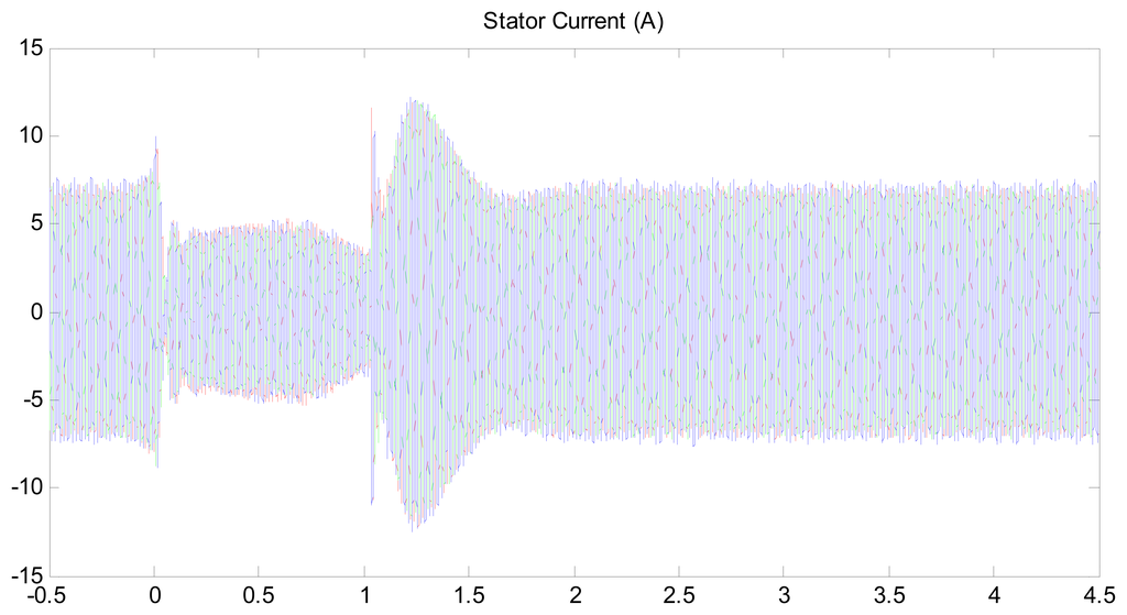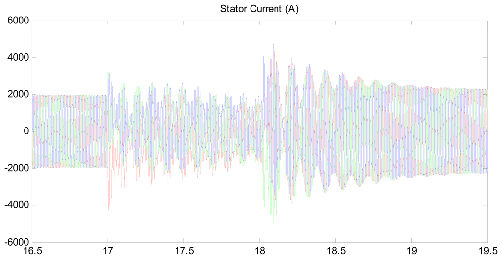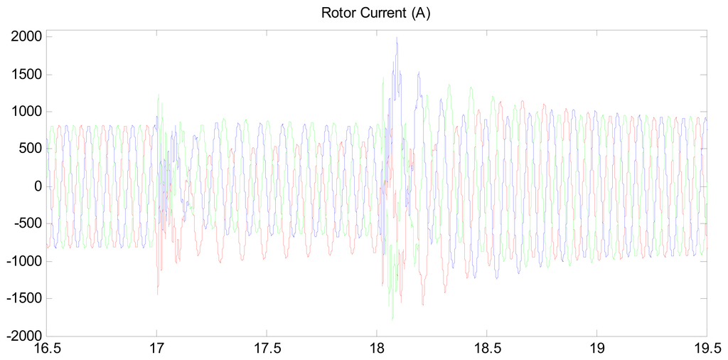 The stator currents achieve peak values that reach two times the rated value (Figure 8). This is not a problem, due to the brief duration of the fault and the robustness of the stator windings. On the other hand, the rotor system, which must be protected from high currents, presents peaks that are slightly beneath two times their rated value (Figure 9). When the voltage dip is detected, the proposed method begins to work imposing a rotor current which is limited by the control system, as stated in Section 3, “Improvement of the control strategy”. This would mean that the first peak at t = 17 s is beneath the limit value that has been previously stated for both converter and rotor. In this case it has been chosen to allow a rotor current which is two times the rotor rated current. The second current peak, after t = 18 s, coincides with the change of the voltage sag control strategy to the default machine control (Maximum Power Point Tracking strategy). The described current peak is therefore in close relation with the way the machine control has been coded. It is thus possible to fully eliminate this second transient but it does not represent a priority in the solution presented here. These peaks have a short duration (less than 20 ms) not representing, therefore, a risk to the electronic power devices, since typical power IGBTs allow ICRM (repetitive maximum collector current) of two times ICnom, under a correct temperature [19].