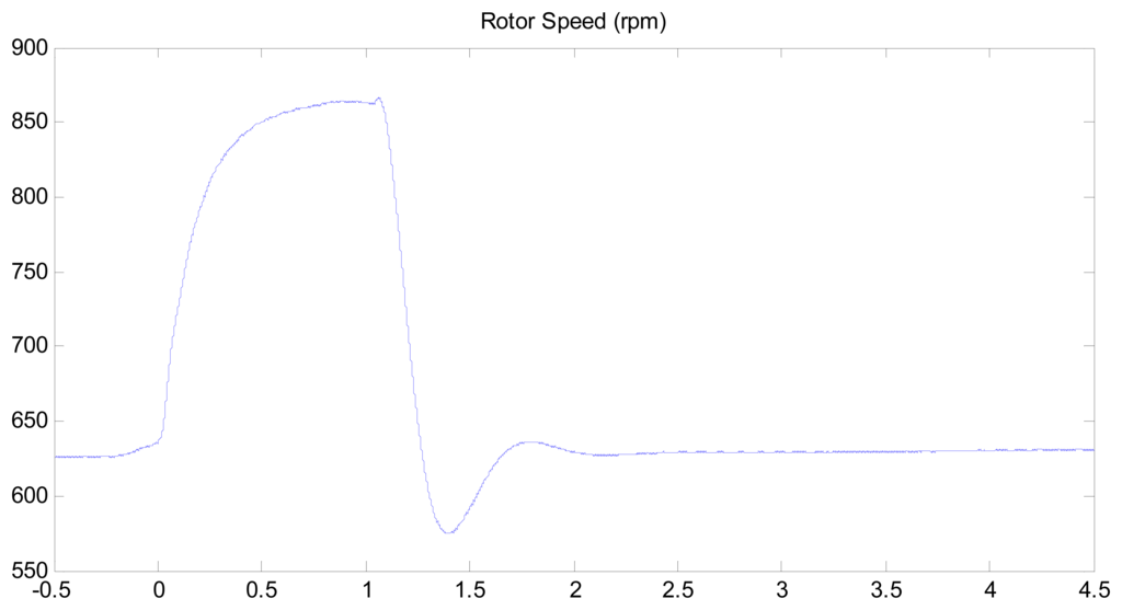 As previously noticed in the simulation, the machine accelerates during the experiment, as shown in Figure 16, due to the reduction of the electric power delivered to the grid. This acceleration is substantial due to the fact that the system that emulates the wind turbine (a DC motor) has a much smaller relative inertia compared to that of a real wind turbine.