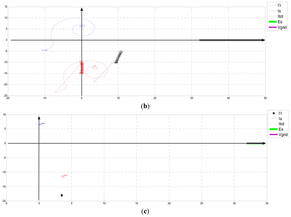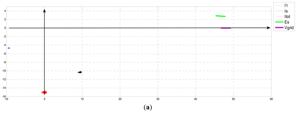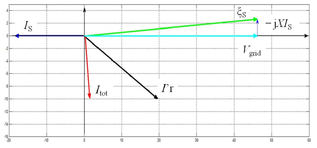 In Figure 4, the Vgrid and ξS phasors are aligned, meaning that no active power is being delivered to the grid. On the other hand, the IS phasor has a 90° lead when compared to Vgrid. This is coherent with the fact that only reactive power is delivered to the grid. Further detail on the relationships between ξS, Vgrid, IS, Ps and Qs, and the model which has been used, can be found in reference [17].