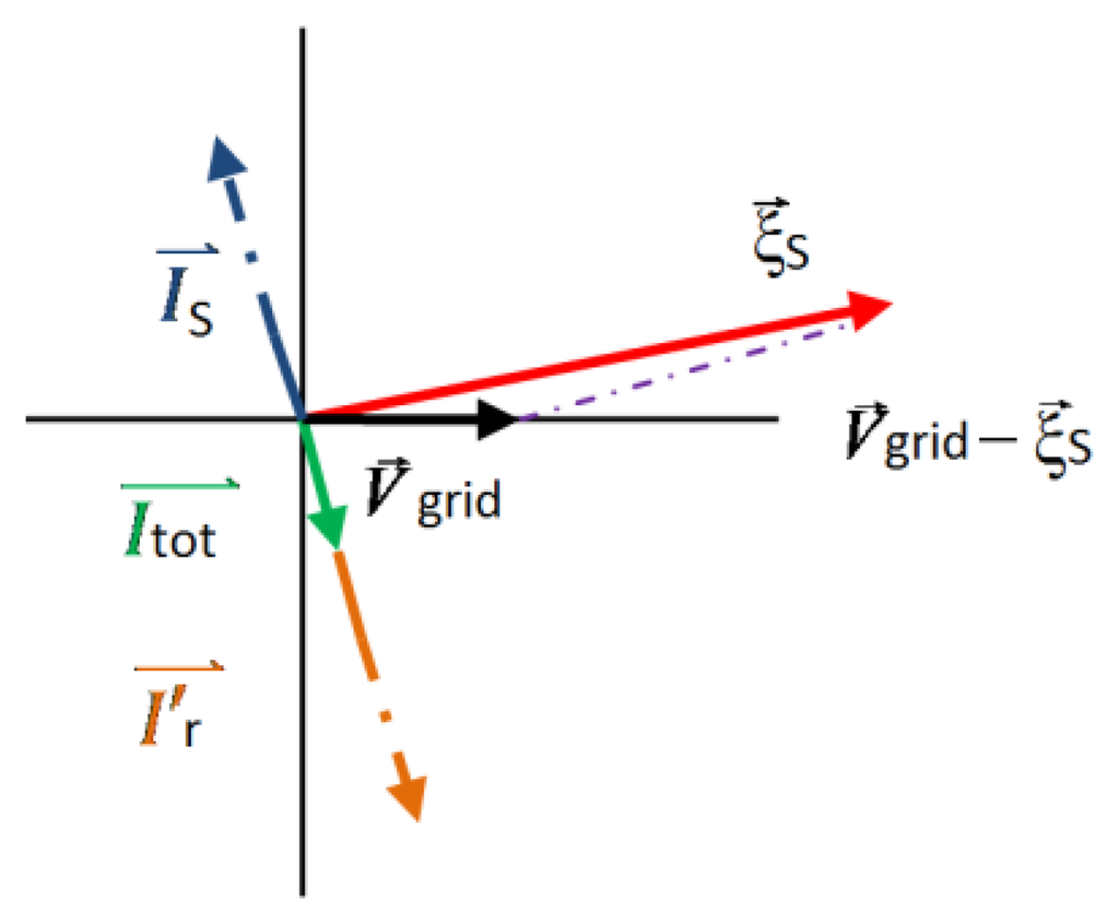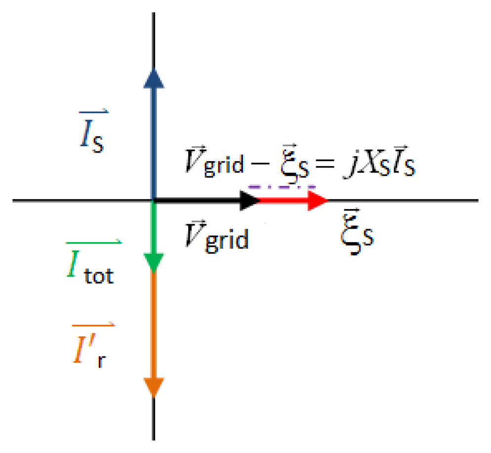 In the event of a voltage dip, V⃗grid drops rapidly increasing the value of the V⃗grid − ξ⃗S phasor as well as modifying its position. Consequently, the stator current is disturbed, its value increases and its position is altered, following the evolution of the V⃗grid − ξ⃗S phasor as shown in Figure 3.