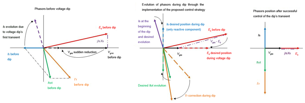 To sum up, Figure 5 is presented. This figure illustrates the effect of the transient state introduced by the voltage dip, the effect of the proposed control strategy and the evolution of the relevant electric variables attained during the voltage sag through the correction of the rotor currents as suggested in Expressions (8) and (9).