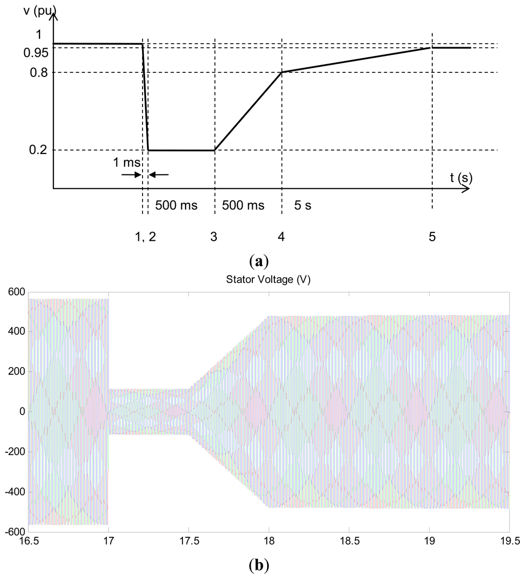 The results that are going to be presented were obtained after simulating a three-phase symmetrical voltage sag while the generator is operating at its rated power. The profile of this voltage sag (Figure 6) corresponds to the standard established by the Spanish national grid operator, REE [18].
