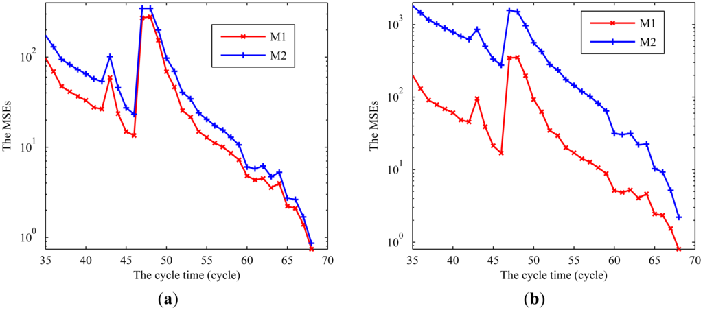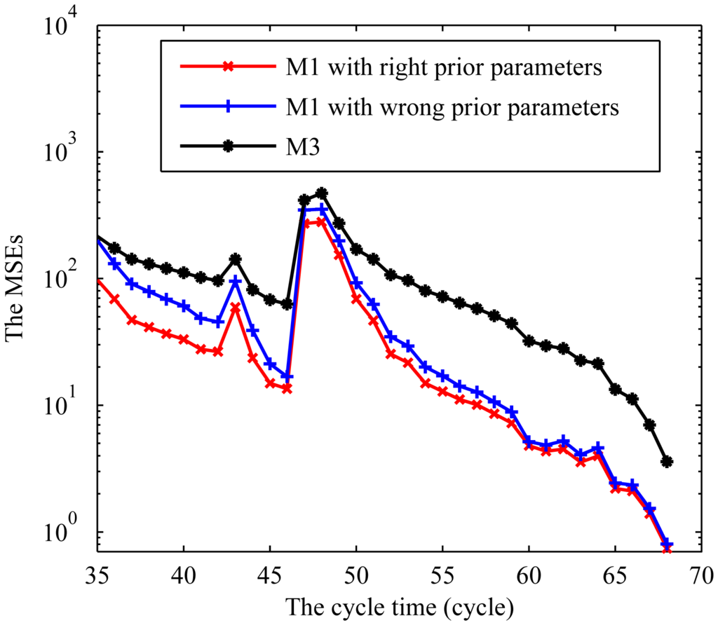 Additionally, we give the results of the MSEs at some CM points as shown in Figure 10. It can be observed that the proposed method obtains better accuracy than the MLE method and has certain robustness over the selection of the prior information. Moreover, the MLE method cannot apply the prior information for the RUL prediction. This further demonstrates the superiority of the proposed method.