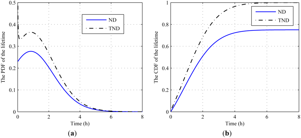 First, we provide a numerical example to show the effect without considering the restriction that w − xk > 0. For illustrative purposes, the parameters in the degradation process are assumed as w = 10, yk = 9 and Φ = {1,0.01,0.09,2} . Then, the corresponding PDF and CDF of the lifetime are illustrated in Figure 2, where ND represents the traditional normal distribution. Obviously, the PDF and CDF by the traditional normal distribution are smaller than those by the TND.