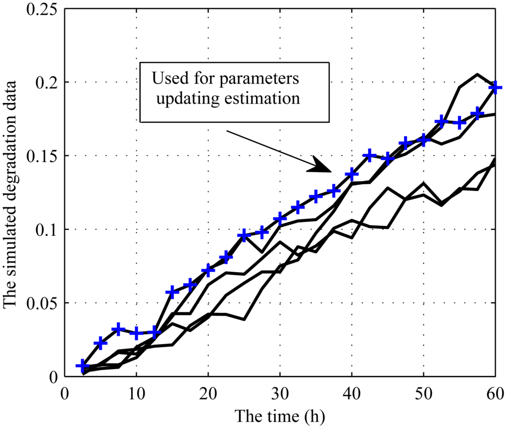 Then, five degradation paths are generated to demonstrate the validity of the proposed offline MLE method. For illustrative purposes, the parameters for the degradation process are assumed as Φ = {3×10−3,4×10−8, 1×10−5,2×10−5} . The degradation paths are simulated by the Euler approximation method with measurement frequency of 2.5 h, as shown in Figure 3.