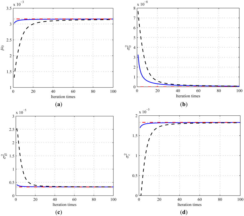 To demonstrate the interesting consequence derived in this paper, we use the third simulated degradation paths to illustrate the iteration process of the combination algorithm of the Bayesian updating and EM algorithm through estimating the unknown parameters of a specific item. Using the MLE method in Reference [40], the estimated results are Φ̂ |MLE = {3.3279×10−3,0,1.3245×10−6,2.3885×10−5} . The real and random prior parameters are respectively used for the parameters updating, where the random prior parameters are chosen as Φ = {1×10−3,9×10−8,3×10−5,1×10−5}. The iterative process of 100 times is illustrated in Figure 4. It is shown that the iteration based on the right prior parameters converges faster than that under the random prior parameters. However, they all converge to the results by using the MLE directly.