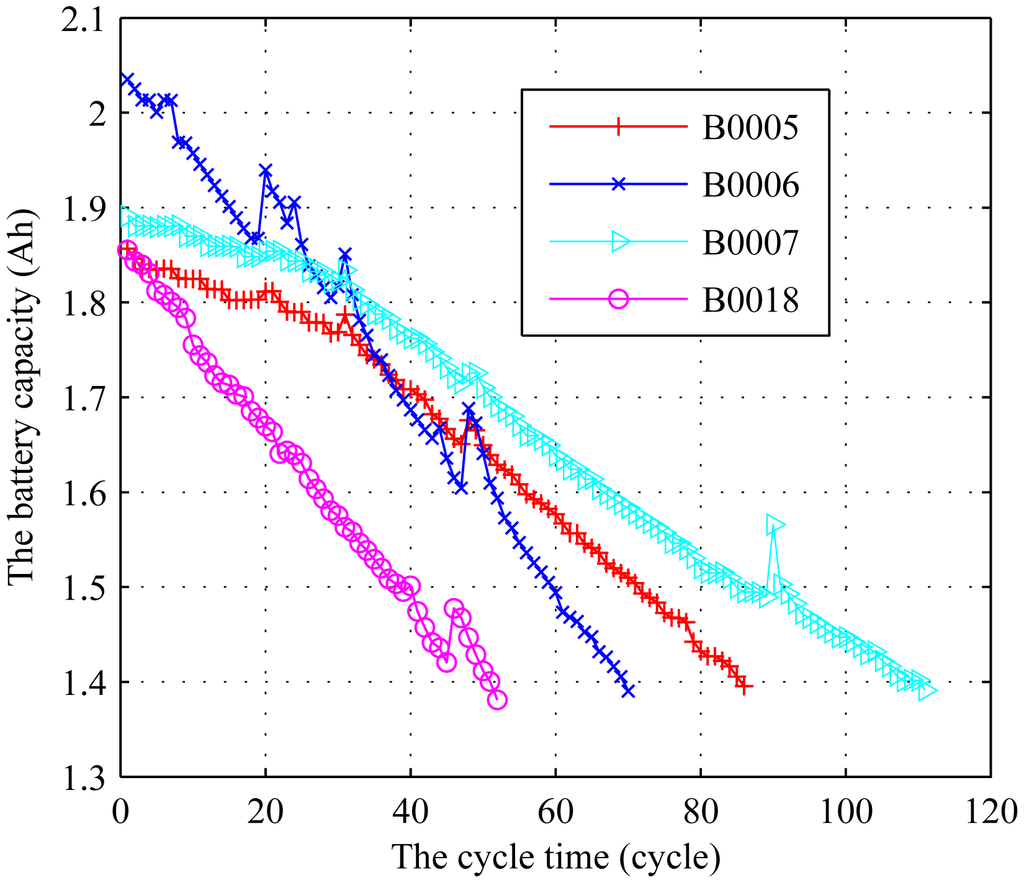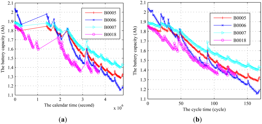 In this experiment, we use the data collected from the National Aeronautics and Space Administration (NASA) Ames Prognostics Center of Excellence to demonstrate the effectiveness of our algorithm [55]. The degradation data includes four Li-ion batteries run through three different operational profiles (charge, discharge and impedance) at room temperature. The use of the lithium-ion battery is a process of repeatedly charging and discharging. Based on the analysis of the available performance measures of the lithium-ion batteries presented by Jin et al. [12], the capacity can be used to characterize the long-term degradation process induced by the charge-discharge operational cycle. The cycle life of the battery is defined as the number of times a battery can be recharged before its capacity has faded beyond acceptable limits (20%∼30% of the rated capacity). The degradation data from NASA included two time scales, i.e., calendar time and cycle time [12]. The degradation data based on the two time scales are shown in Figure 5.