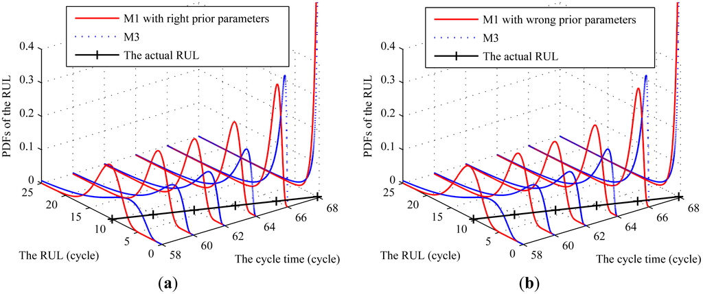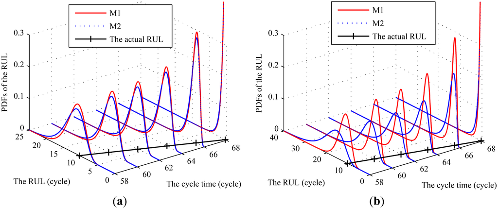We set iteration interval length Lit = 10 for the RUL prediction with right prior information and Lit = 5 for that with inappropriate prior information. The corresponding PDFs of RULs under M1 and M2, and the actual RULs at some different CM points are shown in Figure 7. From Figure 7, it can be observed that, for the case with the right prior information, the range of the PDFs of the RULs based on both methods could cover the actual RUL. However, the uncertainty in the estimated RULs of M1 is less than that by M2. For the case with inappropriate prior information, the PDFs based on M1 could cover the actual RULs. However, the PDFs based on M2 could not cover the actual RULs and thus the maintenance is delayed if such predictive result is applied in maintenance schedule. This indicates that the proposed method could obtain desirable results regardless of the quality of the prior information.