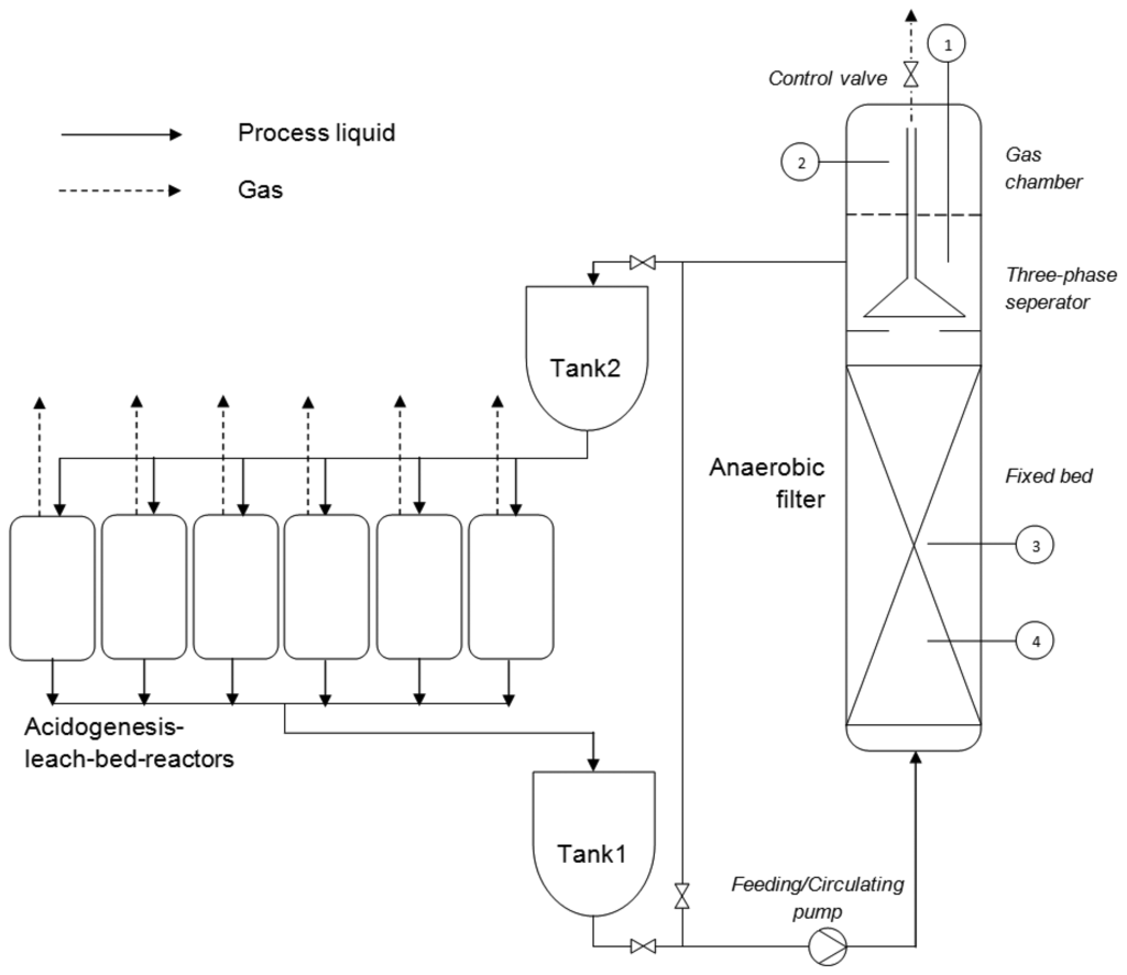 Both the anaerobic filter and the leach-bed reactors had gas outlets that were connected to gasbags for gas quality and gas quantity measurement. In order to provide good contact between the microbes and the substrate, the process liquid in each reactor was internally recycled five minutes every ten minutes at a flow rate of 0.6 L·min−1.