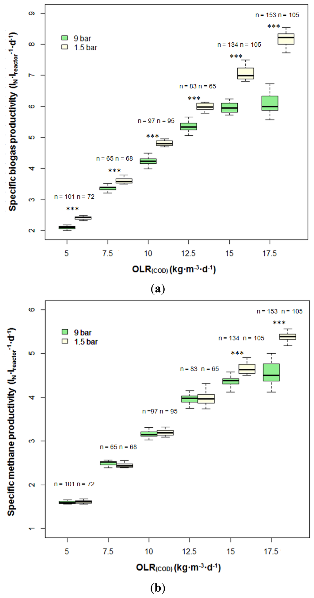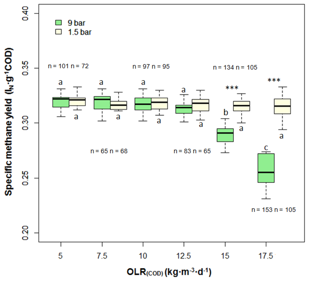 The standard methane yield in terms of one gram fed COD is expressed as specific methane yield (SMY), which is demonstrated in Figure 3. At OLR(COD) of 5–12.5 kg·m−3·day−1, the SMY gained from 9 bar and 1.5 bar remained constant at 0.32 ± 0.01 LN·g−1COD. As OLR was further increased, the SMY at 9 bar slumped and ended at 0.25 ± 0.01 LN·g−1COD at OLR(COD) of 17.5 kg·m−3·day−1. In contrast, the SMY at 1.5 bar was more stable at 0.31 ± 0.01 LN·g−1COD. Statistically, the SMY between the pressures did not show any significant difference until OLR was raised to 15 kgCOD·m−3·day−1. After that, the reactor running at pressure of 9 bar was characterized by much lower SMY.