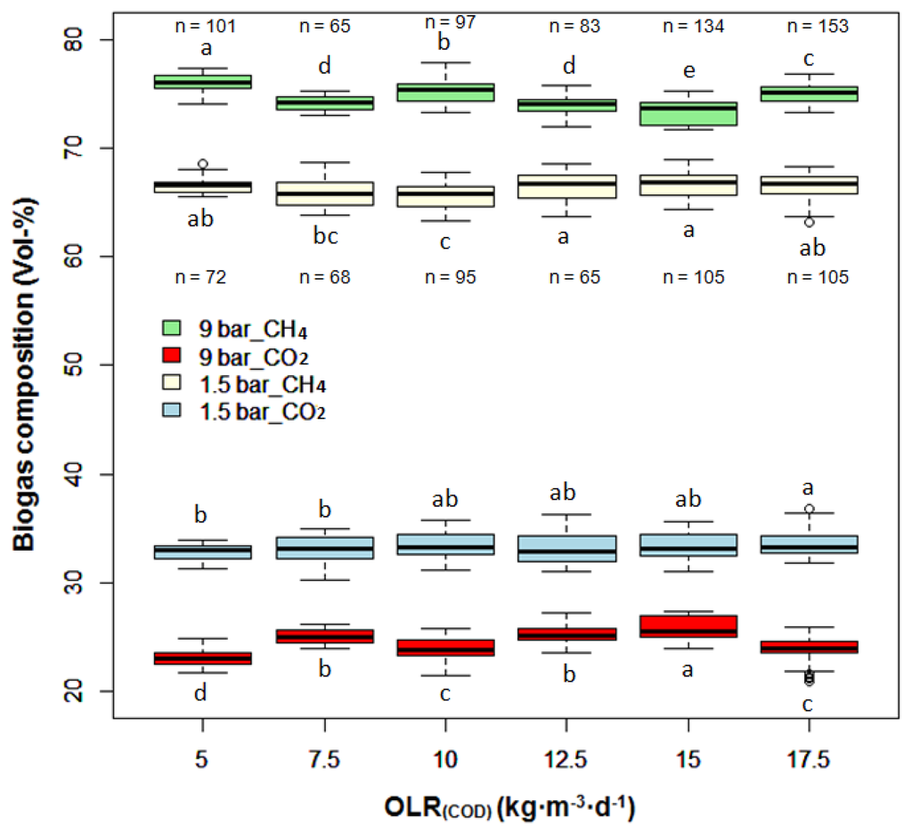 The experiments in this study were conducted successively at an absolute working pressure of 9 bar and 1.5 bar in a lab-scale pressurized anaerobic filter reactor in a two-phase process. Six different OLR(COD)s (5, 7.5, 10, 12.5, 15, and 17.5 kg·m−3·day−1) were applied to the anaerobic filter at both pressures. The OLR was increased by increasing flow rate. That correspondingly reduced hydraulic retention time (HRT) from 3.9 day to 1.2 day at 9 bar and from 3.9 day to 1.3 day at 1.5 bar. By this means, the influence of OLRs on the system stability and performance of the pressurized anaerobic filter was explored. Gas production, gas quality, pH-value, volatile fatty acids (VFAs), chemical oxygen demand (COD), degradation grade and buffer capacity were analyzed and compared.