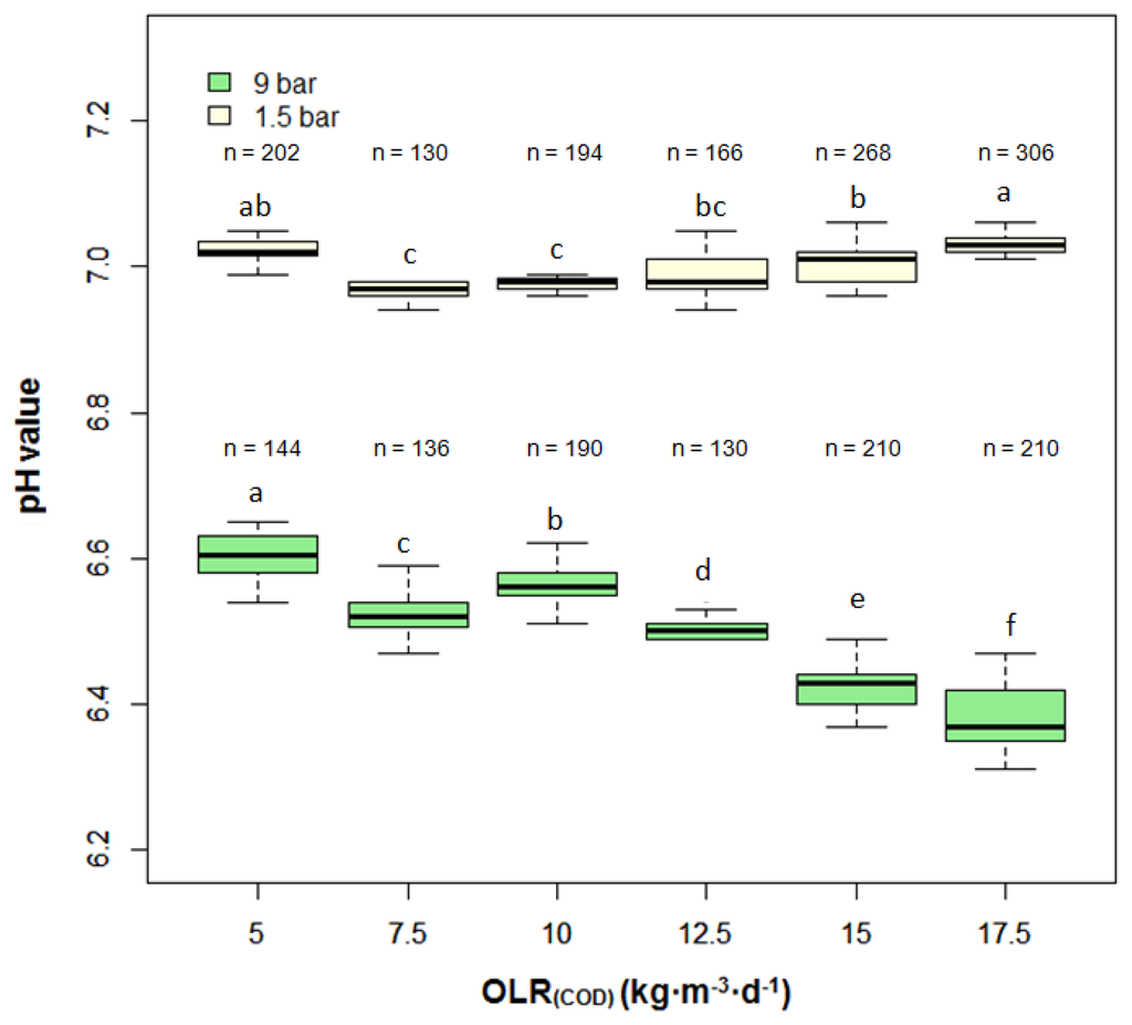Figure 5 shows the average pH value for every three hours in the anaerobic filter. It was observed that the pH value at 9 bar was much lower than that at 1.5 bar. Despite a small fluctuation, the pH value of the anaerobic filter at 9 bar gradually decreased from 6.6 to 6.4, with OLR(COD) increasing from 5 kg·m−3·day−1 to 17.5 kg·m−3·day−1. In contrast, the pH-value at 1.5 bar was relatively stable, remaining at approximately 7.0 during the entire experiment.