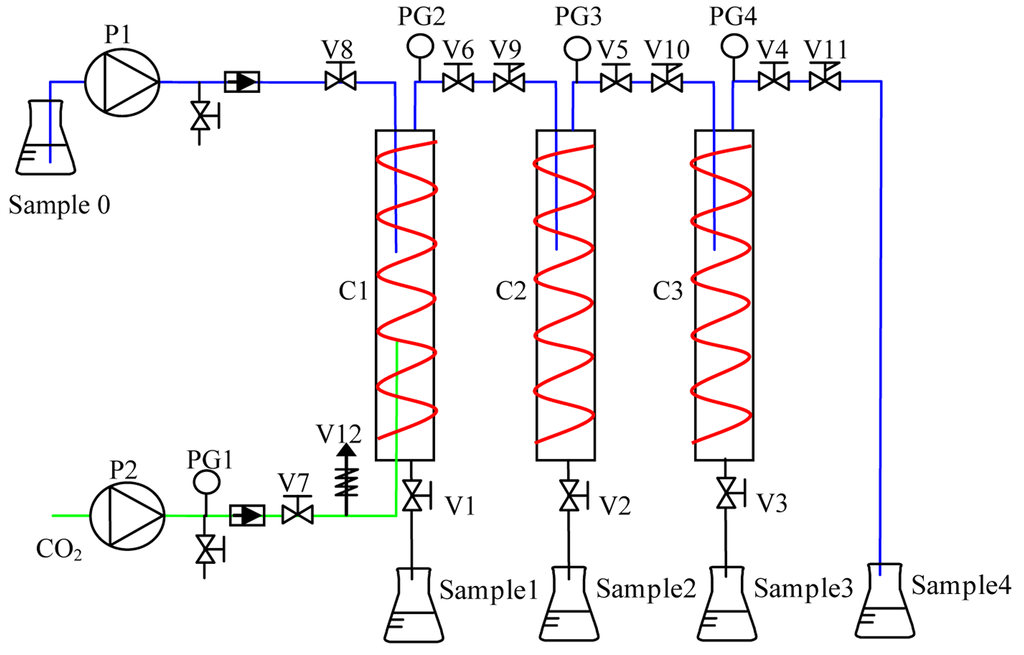 In this study, an impure FAME mixing solution was used in a SC-CO2 fractionation system (Lian-Sheng, Taichung, Taiwan) which was obtained from the waste biodiesel sample. All runs of the experiment were performed in three 500 mL columns (high pressure vessels with a heater jacked inside) made of stainless steel (SS 316). They were packed with stainless steel fragments. The schematic diagram of SC-CO2 fractionation is shown in Figure 1. In a typical run, the system was heated with an electrical heater jacket and the power was adjusted to create a system temperature of (40–70 °C). If the first column of system was pressurized at 30 MPa, the second and the third column were reduced by increments of 5 MPa, respectively. In other words, the second column was at 25 MPa and the third one at 20 Mpa. The system was pressurized with bottom feeding CO2 (Jing-Shang Gas, Kaohsiung, Taiwan) using a high pressure meter pump (Teledyne Isco, Lincoln, NE, USA). After the setup of fractionation conditions, a sample (70 mL) was loaded and pumped into the first column from the top using a high-pressure liquid pump with a 6 mL/min flow rate and maintained at a SC-CO2 flow rate of 7–21 mL/min for a retention time of 30–90 min. The sample was pumped out at the middle of the column and encountered SC-CO2. A soluble sample with pressured SC-CO2 was guided to the next column for separation under controlled pressure and temperature. After completion of each fractionation experiment run, the high-pressure valves of each outlet were opened to depressurize and collect the samples. If the first column was loaded with a SC-CO2 of 30 MPa, four samples were all collected. If the pressure started at 10 MPa, two or less samples were collected due to the low amount of SC-CO2 and low solubility.