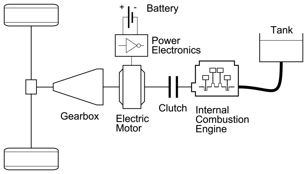 The vehicle under investigation is a pre-transmission parallel HEV passenger car of the executive class. Figure 1 illustrates the configuration of the powertrain architecture which consists of an automatic gearbox, an electric motor, the power electronics, a battery, a clutch and a turbocharged spark-ignited internal combustion engine. The vehicle does not exist yet physically, therefore, the basis for the subsequent vehicle model is a generic vehicle model according to commonly accepted modeling standards []. To simulate the vehicle, a quasi-static backward approach is used. This widely adopted method of simulation [,,,] was shown to yield reasonable estimates of fuel consumption when compared to measurement data [].
