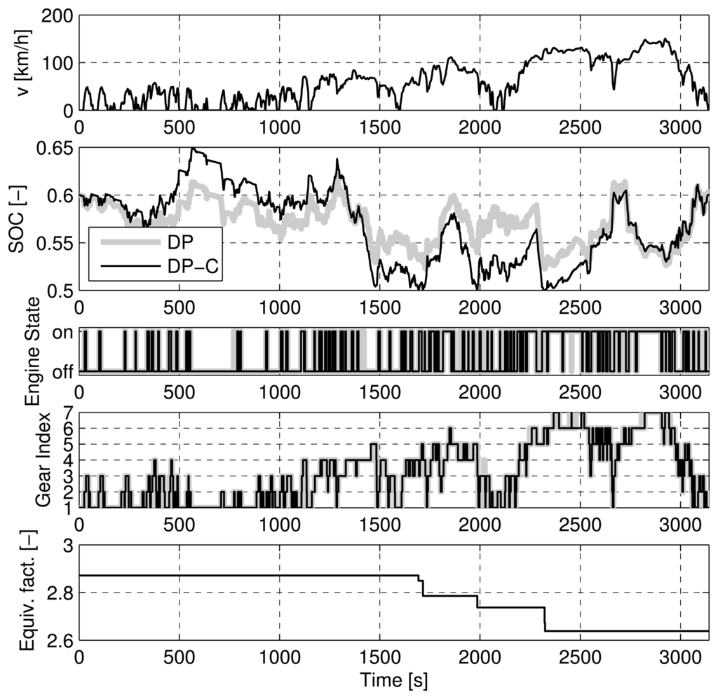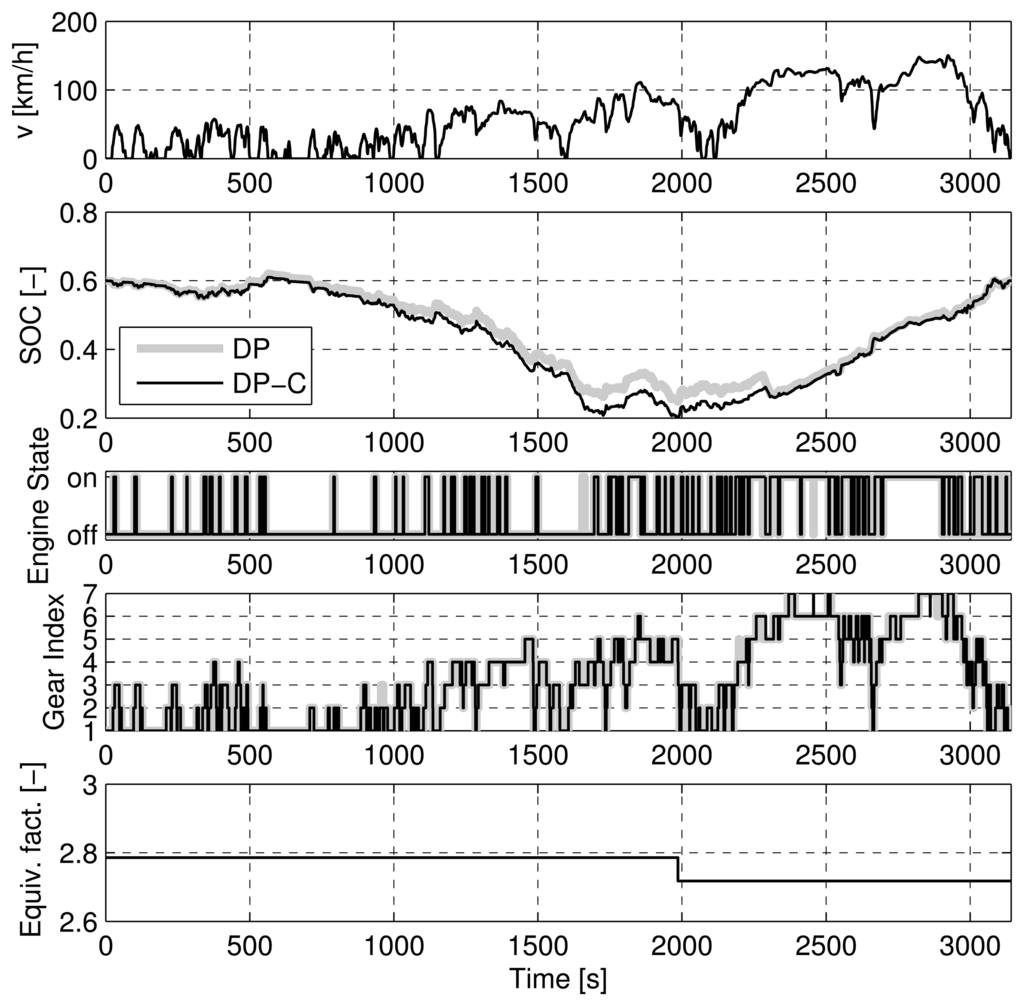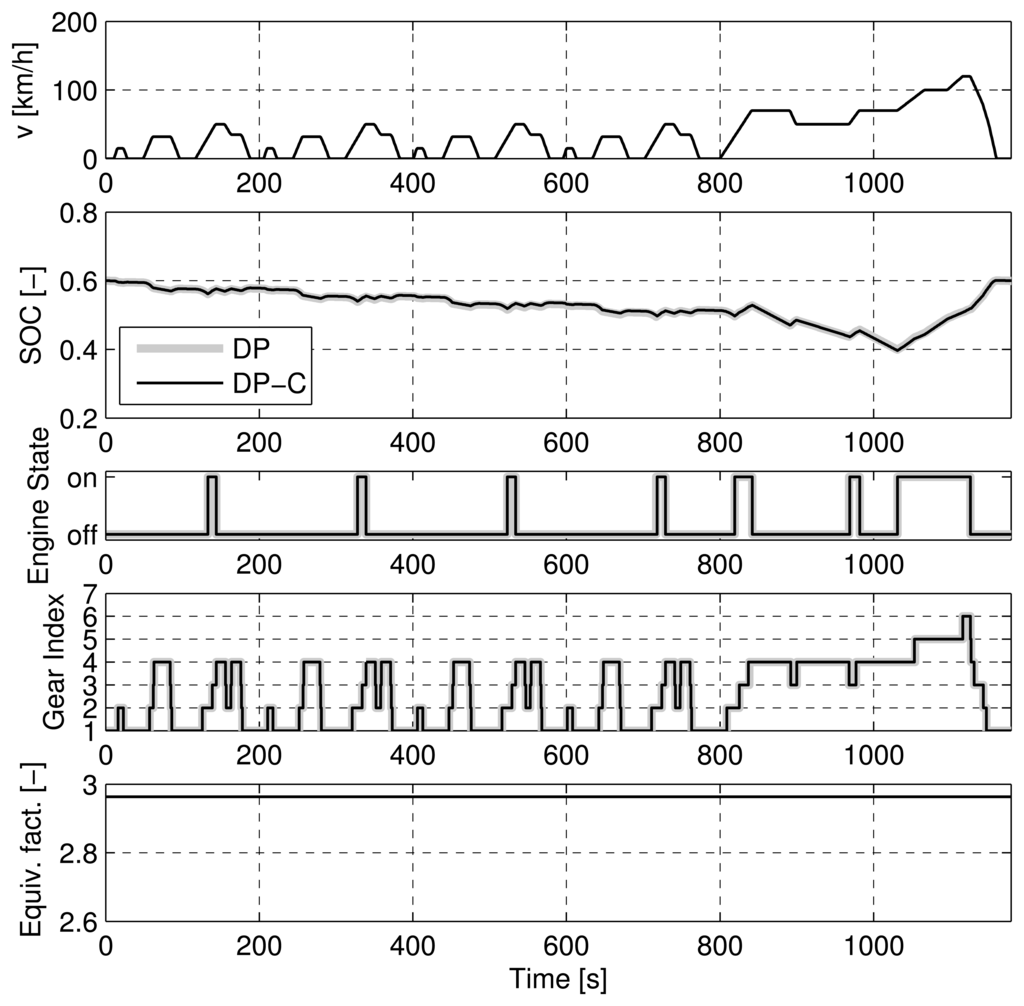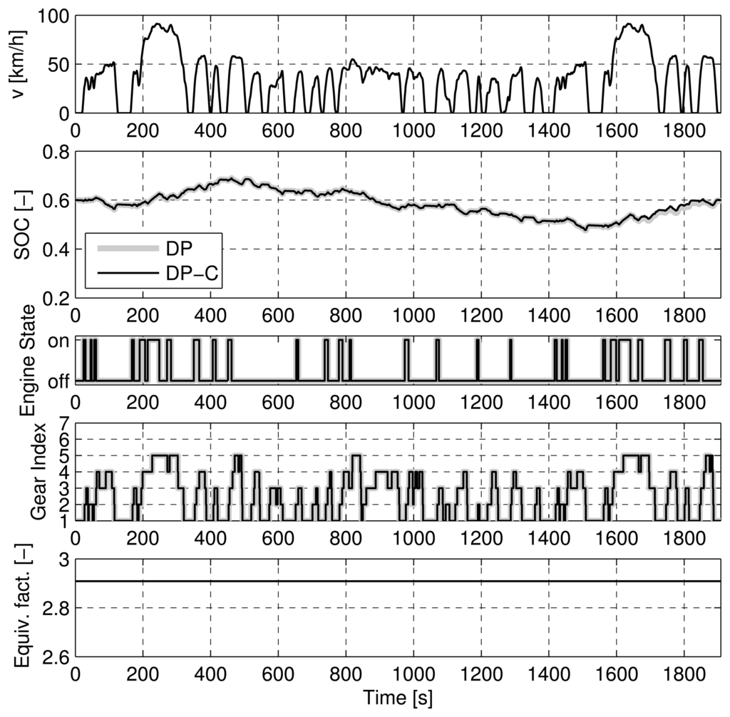 Figures 7, 8, 9, and 10 show the trajectories of the SOC, engine on/off state, the gear state, and the equivalence factor for the four cases considered above. For the NEDC (Figure 7) and the FTP (Figure 8), the trajectories show an almost perfect match of the DP-C and the DP methods (except for one up- and downshift in the FTP). For the two CADC cases, the trajectories do not match well. As described above, the mismatch is attributable to the error introduced by the discretization of the SOC state. Particularly at the border of the feasible state space, the interpolation errors between the feasible and the infeasible state space lead to an error in the cost-to-go function [].