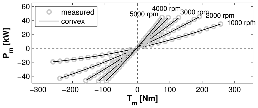 The model fit for the electric motor compared to the underlying measurement data is shown in Figure 2. The measurement data were obtained for a 25 kW permanent magnet synchronous motor. The torque axis is then linearly scaled with the nominal power while the efficiencies are kept constant. For more information on the scaling method, see for instance [,]. Clearly, the fit is very good in the entire operating range.
