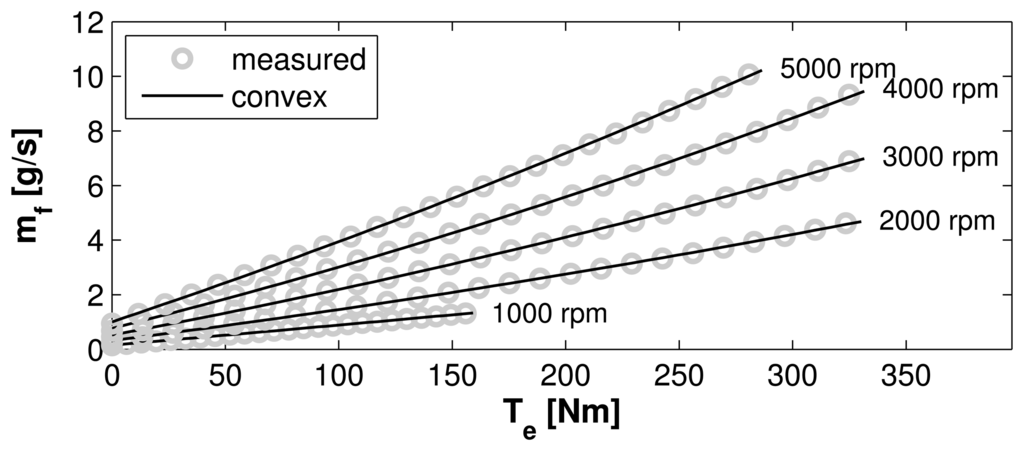 In order to apply the concepts presented in Section 4 below, the generic, nonlinear vehicle model has to be approximated by a convex model, see [] for a general introduction to convex optimization, and [,] for an introduction to convex modeling and optimization of HEVs.