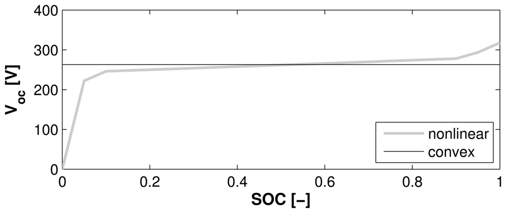 The battery is assumed to be of the LiFePO4 type [,] with the data taken from []. It is modeled as an equivalent circuit with an open-circuit voltage Voc in series with a constant internal resistance Ri []. In the nonlinear model, the open-circuit voltage is a function of the SOC as shown in Figure 4. In the convex model, the open-circuit voltage is assumed to be constant. The assumptions of a constant open-circuit voltage and a constant resistance are reasonable in the typical operating range of the battery [,,,]. Figure 4 shows a comparison of the two models.
