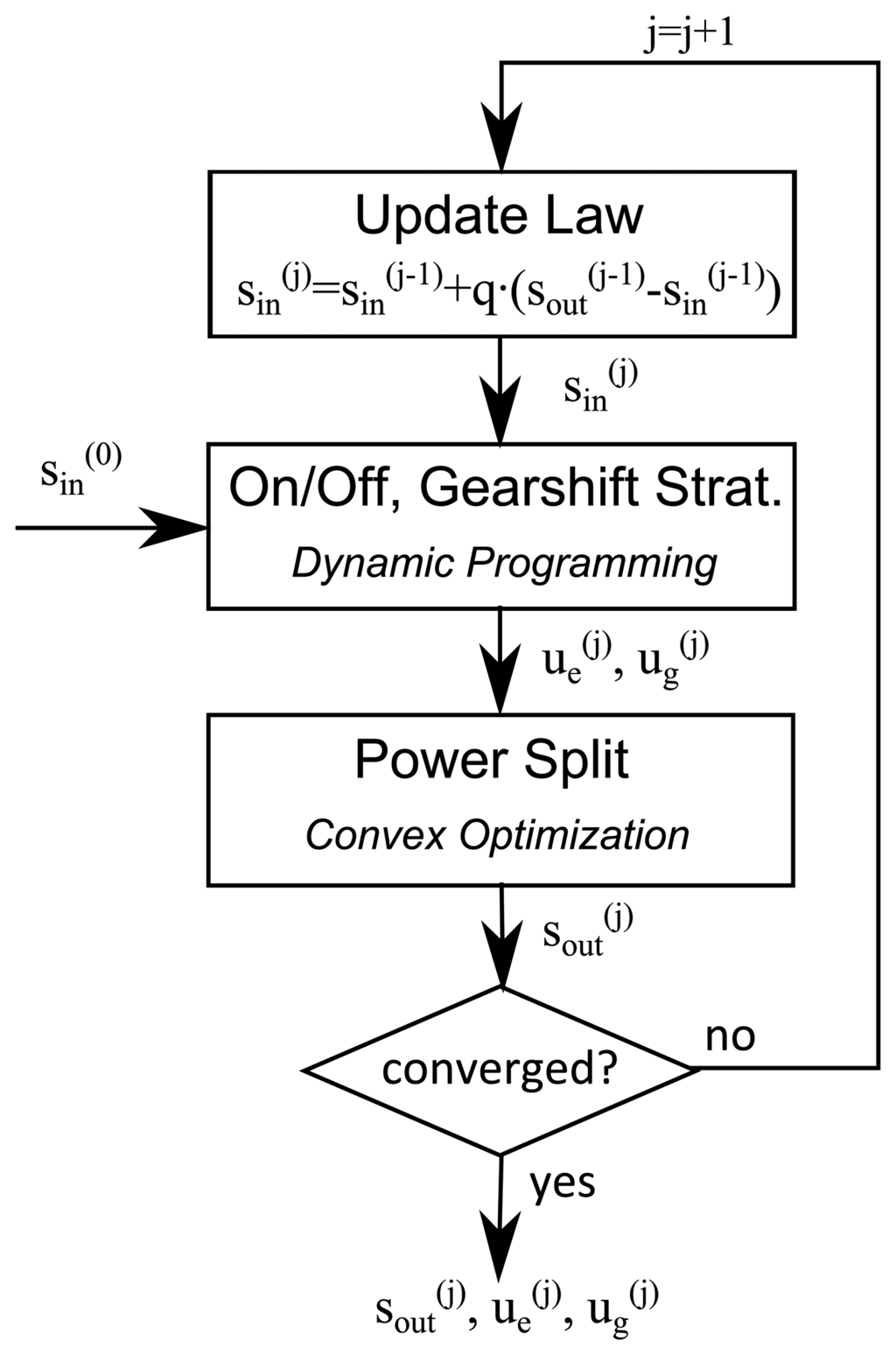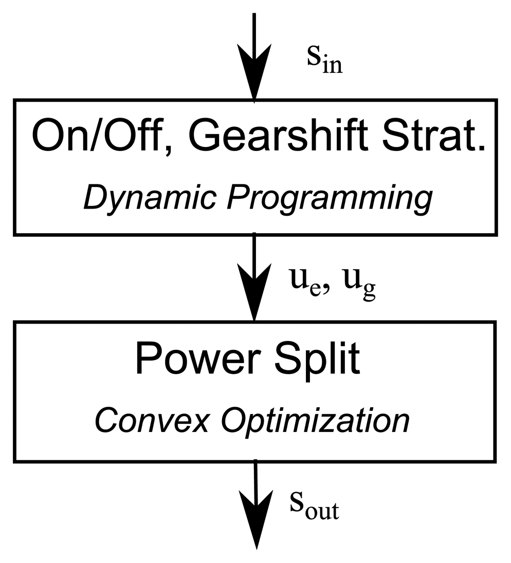 As illustrated in Figure 5, the above ideas are combined to perform a sequential optimization of the engine on/off and of the gearshift strategy using DP and the power split strategy using convex optimization. The input to the DP is the equivalence factor sin, and the output of the DP consists of the gearshift strategy ug and the engine on/off strategy ue. Here, sin stands for sin(k) ∀k ∈ {1, …, N}. A similar notation is used for s, sout, ue, ug. In a next step, a new equivalence factor sout is calculated by solving the convex optimization problem in Equation (27) for the previously calculated values of ug and ue.