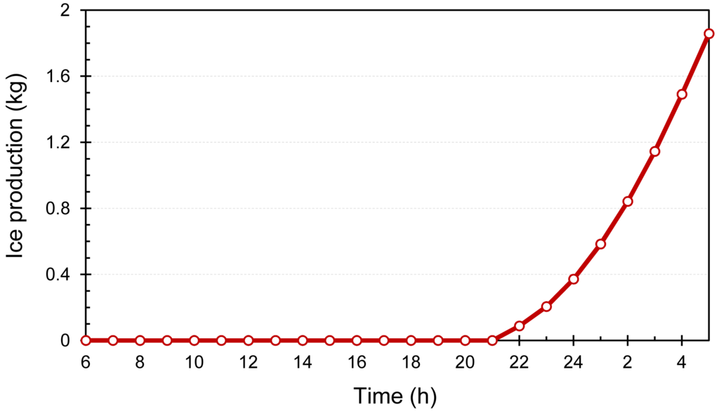 The amount of ice produced is shown in Figure 10. During the day no ice was produced because evaporator was not connected with the beds. The ice was produced during the night when the water temperature become 0 °C or below.