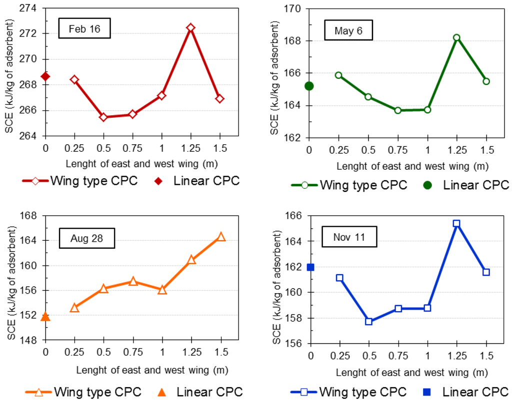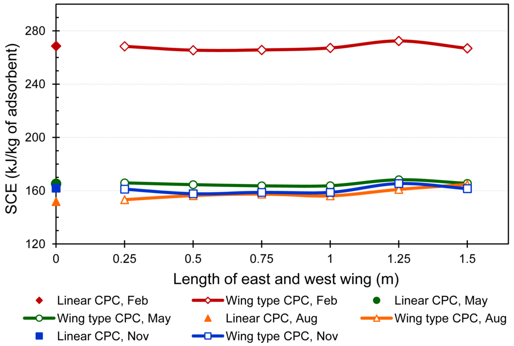 Figure 13 shows the comparison between the systems' performance with the proposed CPC at the optimal length of 1.25 m and with a linear CPC in terms of SCE. It can be noted that the performance increases up to 6% with the wing type CPC compared to the linear CPC in the month of August and increases by up to 1.42% in the month of February.