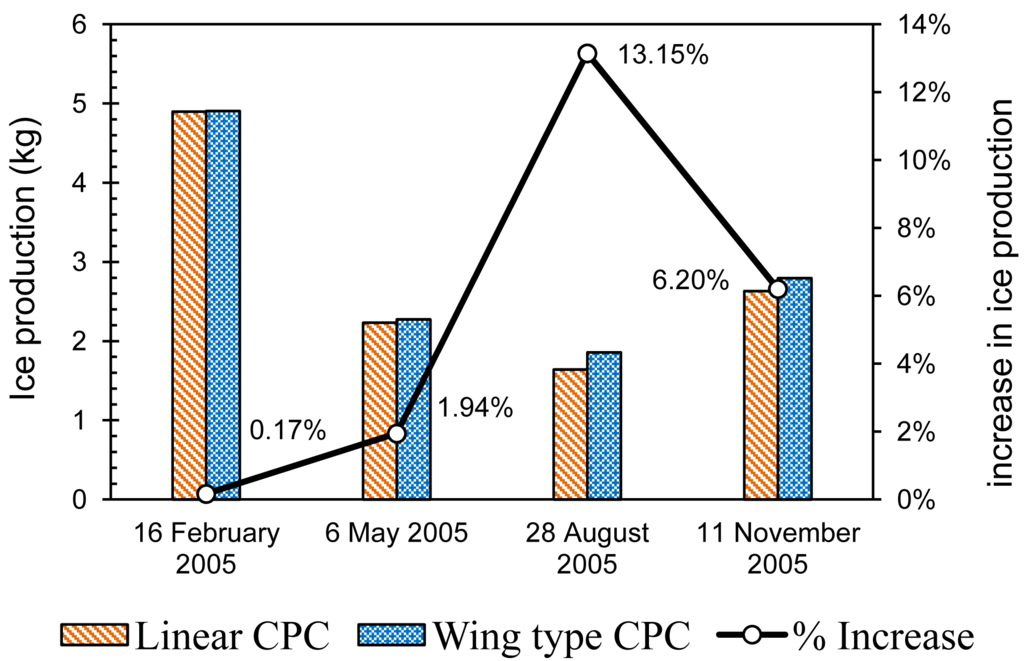 Similarly, the results were summarized for the ice production with the wing type CPC at 1.25 m wing length and compared with the ice production with a linear CPC for a whole year's season (Figure 14). Here again the wing type CPC produced a maximum 13% more ice in the month of August compared to the ice produced with linear CPC. The maximum amount of ice was produced in the month of February and almost all the water in the refrigerator was converted into ice. February is from the peak winter month in Tokyo and according to the actual data used, the ambient temperature were low, around 10 °C during the day and remained around 0 °C during night. Therefore, due to favorable conditions the maximum amount of ice was produced in the month of February.