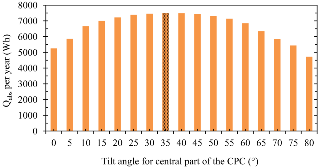 The tilt and bending angles of the CPC wings were optimized by analyzing the energy absorbed at the CPC absorber for a sunny day from each month. A 35° tilt for the south-facing central part of the CPC and a 45° tilt for the wings with 50° angles toward the east and west were found to be optimal for the location of Tokyo, Japan (Figures 2 and 3). It was found that the proposed CPC can provide the effective temperature for a longer period of time compared to the conventional linear CPC. The duration of the effective temperatures increased by up to 2 h in the winter and up to 2.53 h in the summer using the proposed CPC. Therefore, the proposed CPC with wings was used with a solar adsorption refrigerator to investigate the effect on performance of the system.