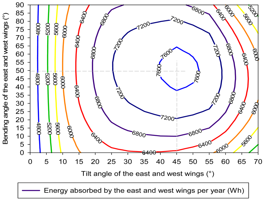 Figure 11 shows the effect of lengths of wings in Tokyo for different seasons of the year. It can be noticed that a wings lengths of 1.25 m shows the maximum performance in all seasons, except for August, where the maximum performance was found to be at 1.5 m length. It should also be noted that proposed CPC was optimized for year round operation. The performance of the collectors depends on the tilt and bending angle of the wings. In August, the optimum angle settings and weather data were favorable for the wings; therefore, the results show the maximum performance at 1.5 m wing length that indicates there was no south wing. The overall year round performance was found to be optimal at the east and west wing length of 1.25 m.