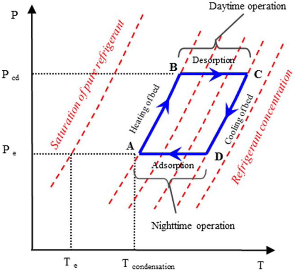 The cycle starts from Point A when the sun rises and the collector heated up the adsorbent bed (A–B)—this is called pre-heating. At a certain Point B, when the adsorbent bed pressure becomes equal to the condensation pressure of the refrigerant, the refrigerant starts desorbing from the adsorbent in vapor form. The adsorbent beds are connected to the condenser where the refrigerant is condensed and collected in the receiver tank while the adsorbent beds are continuously heated at a constant pressure (B–C)—this stage is called desorption. In the late afternoon (Point C) when the solar radiations are not enough to continue the desorption process further, the adsorbent beds are disconnected from the condenser. The temperature and pressure of the beds start decreasing in the evening (C–D)—this stage is called pre-cooling. When the pressure of the beds reaches the evaporation pressure, the adsorbent beds are connected to the evaporator (D–A)—this is adsorption stage. The liquid refrigerant from the receiver tank is allowed to enter the evaporator through the expansion valve where it evaporates and again adsorbed in the adsorbent beds. Evaporation cause cooling in the evaporator that makes ice, and this ice keeps the cold box at a low temperature. In sum, the system is operated with a cycle time of 24 h.
