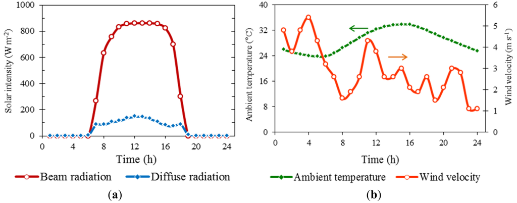 Actual measured solar radiation, ambient temperature, and wind velocity data for Tokyo were used in the simulation (Figure 6). To evaluate year-round performance, weather data for one sunny day in each month were selected. The data were obtained from the commercial software Meteonorm V. 6.1.