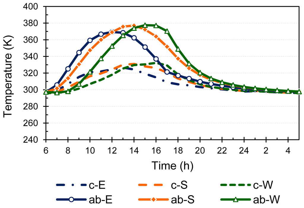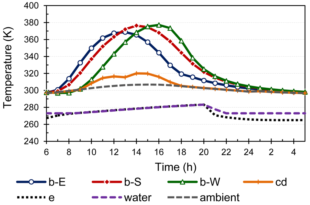 The temperatures of the main heat exchangers of the solar adsorption system are shown in Figure 8. The adsorbent bed temperature of each wing is following its absorber temperature. The condenser temperature increases in the day time and remains around 310 K to 320 K. Such a high temperature is because the naturally air cooled condenser was considered and ambient temperature was also relatively high. The condenser temperature again rises in the afternoon when the desorbed refrigerant starts coming from the west wing as indicated in Figure 8. During the late night the beds' temperature approaches the ambient temperature because the adsorption rate also becomes slow at that time. The investigated system operates intermittently, whereby cooling is produced only at night when the evaporator is connected with the adsorbing beds. Therefore, the evaporator and water temperatures increase during the day due to heat loss to the ambience. When the evaporator is connected with adsorbing beds at night, the evaporator temperature starts decreasing. It was set in the simulation model that when the evaporator and water temperatures became 0 °C or below then the water temperature remains constant, indicating the production of ice.