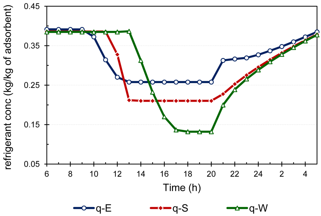 Figure 9 shows the concentration of the refrigerant in each bed. It can be noted that the desorption starts earlier in the east wing and ended soon too. This is because the east wing achieved the required temperature earlier due to its bending angle toward the east, and when the sun moves toward the west, the east wing losses its solar heat capturing efficiency that is needed to continue the desorption process. A similar behavior can be noted in west wing, but in the opposite order. In the west wing, desorption starts late but remains late into the afternoon hours. This shows the advantage of the proposed CPC with wings that the system can operate for a longer period of time compared to the conventional linear collector.