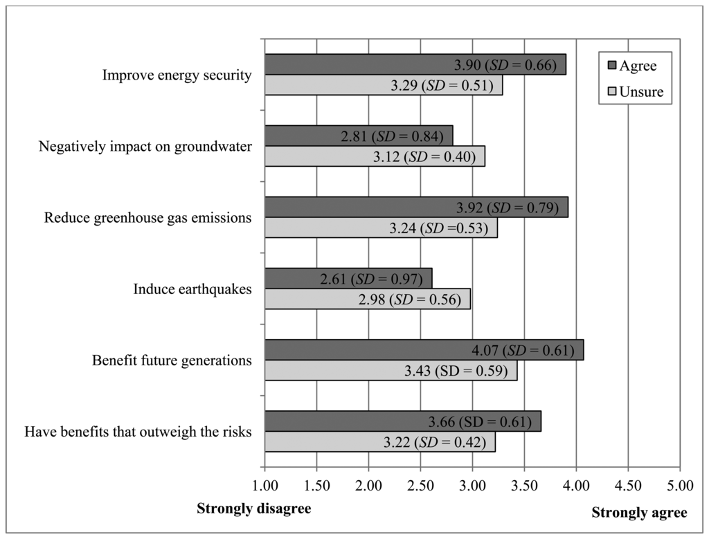 Figure 2 illustrates how the mean ratings of benefits by participants in agreement with the technology were consistently higher and risks were significantly lower, when compared to the responses of the participants that were unsure about the technology. Two risk statements that did not show any statistically significant differences were: F(1, 98) = 0.199, p = 0.657 for “have risks that are unknown” with a mean of 3.41 (SD = 0.805); and F(1, 99) = 0.181, p = 0.671 for “increase the price of electricity” with a mean of 2.86 (SD = 0.861). One statement about benefits also did not show any statistically significant differences: F(1, 98) = 1.289, p = 0.259 “have benefits that are unknown” with a mean of 3.51 (SD = 0.611).